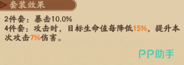 若以野兽召唤队为核心构建,黄月英能最大化发挥机制优势;若暂无完整配套武将,则群伤体系亦为稳妥之选。需注意的是,其强度高度依赖装备协同。推荐优先配置“决斗”系列锦囊套装:两件套提供10%暴击率加成,属基础增益;而四件套则触发核心被动——当自身当前生命值每下降15%,本次攻击伤害提升7%。该效果与黄月英的标记叠加机制深度耦合,可实现多层增益同步触发,显著放大终结阶段的瞬时爆发力。