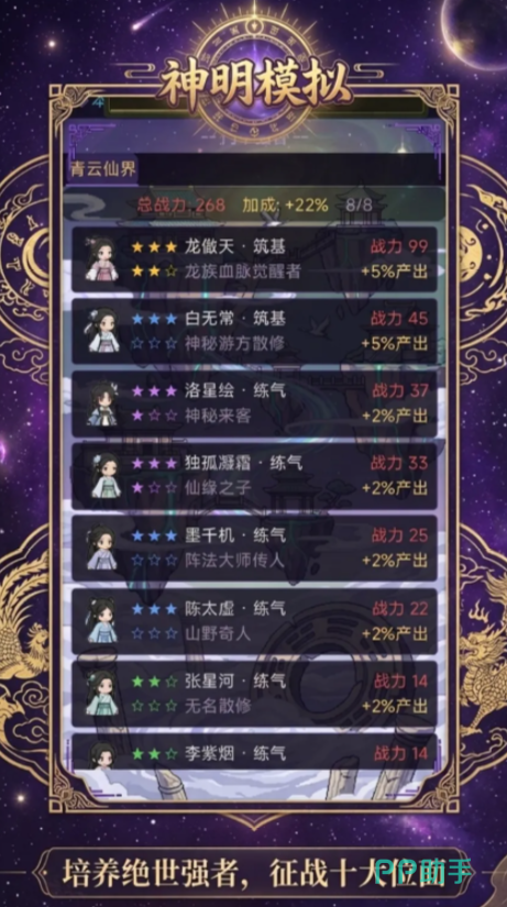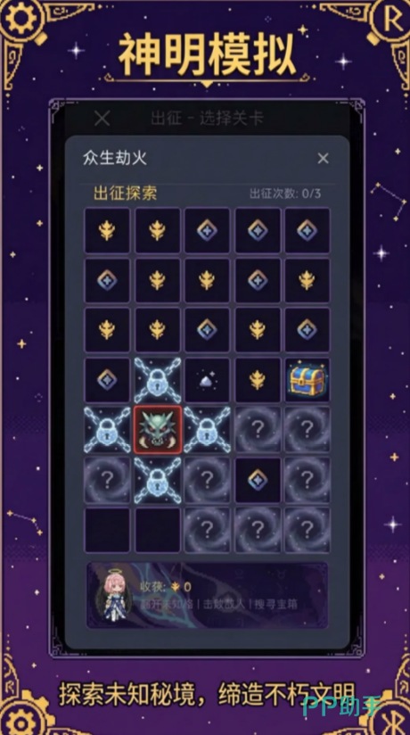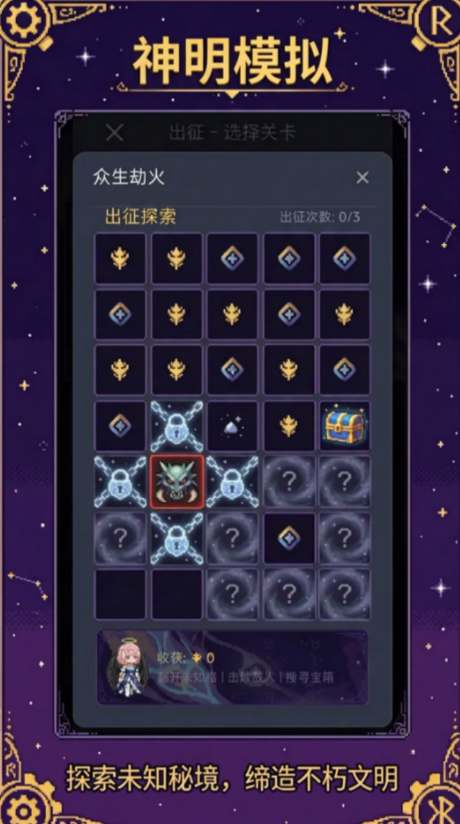 基础战力单位仅能维持局部稳定,深度拓展需持续吸纳绝世强者。每位角色拥有唯一资质图谱(如“星轨共鸣”“法则抗性”“信仰转化率”),其战力数值直接影响所辖位面的资源产出效率、灾厄抵御阈值及文明跃迁成功率。玩家需带领核心团队探索随机生成的秘境空间,在对抗位面畸变体与混沌裂隙生物的同时,收集“源初结晶”“纪元遗刻”“神性尘埃”等关键资源,用于强化神国基建、锻造神级装备、解锁新位面协议。
