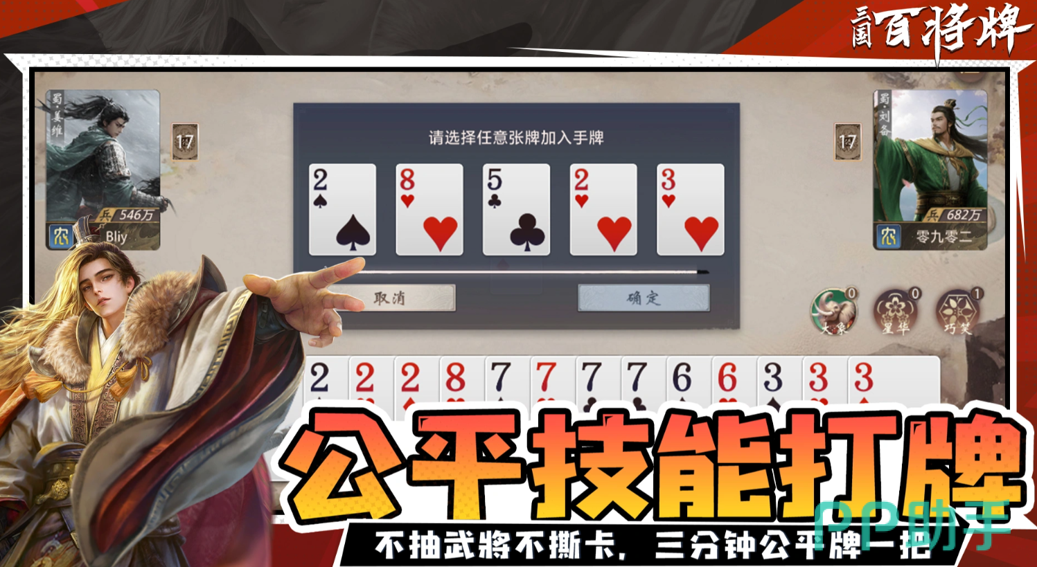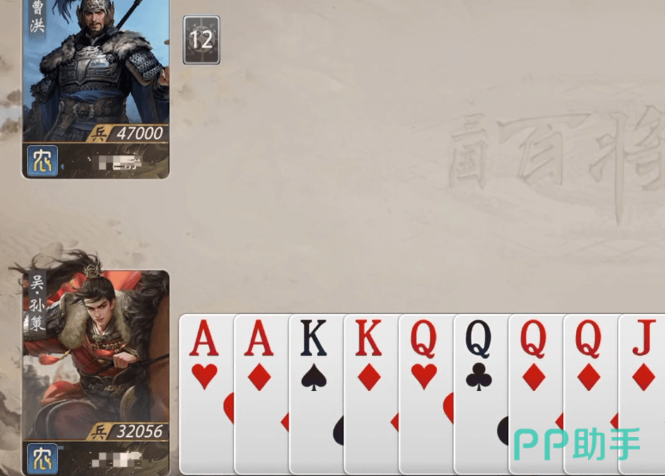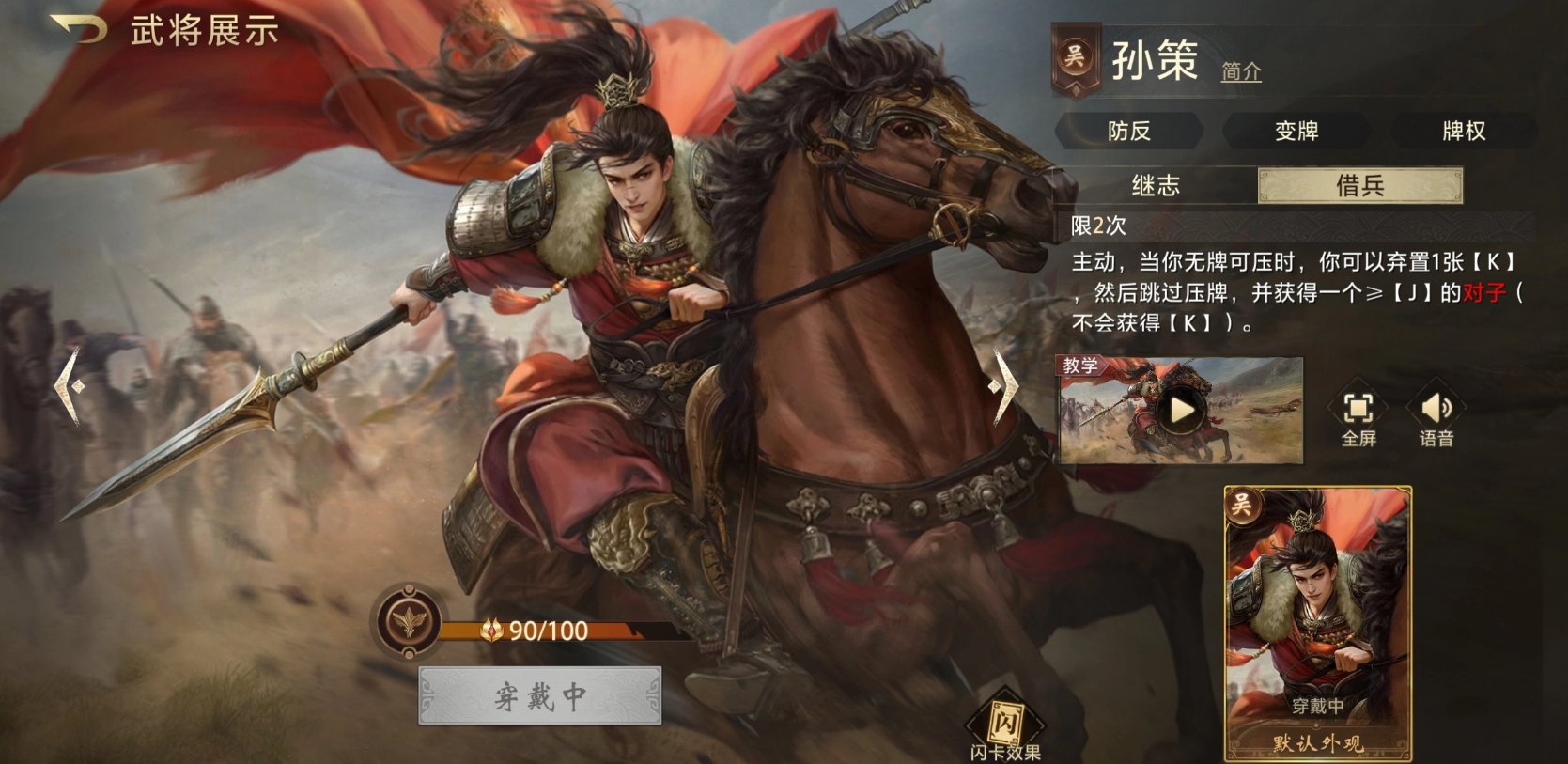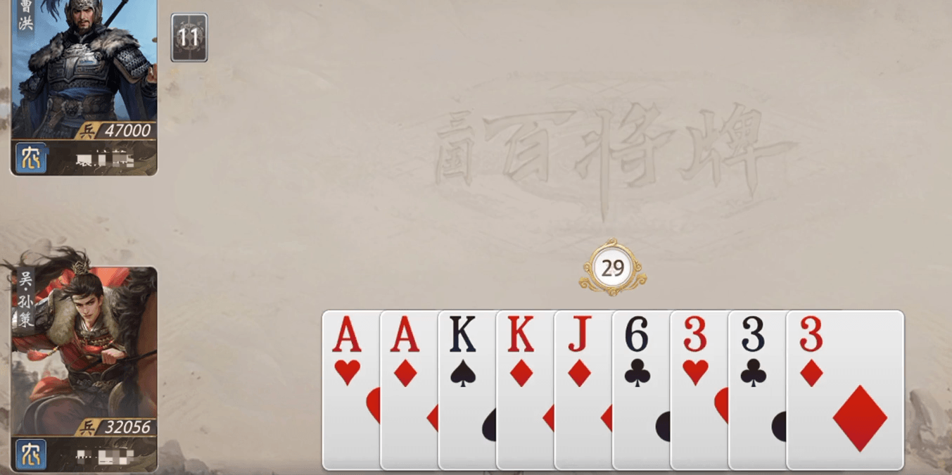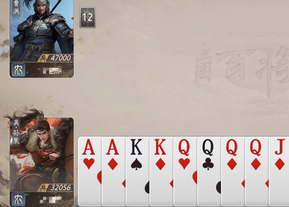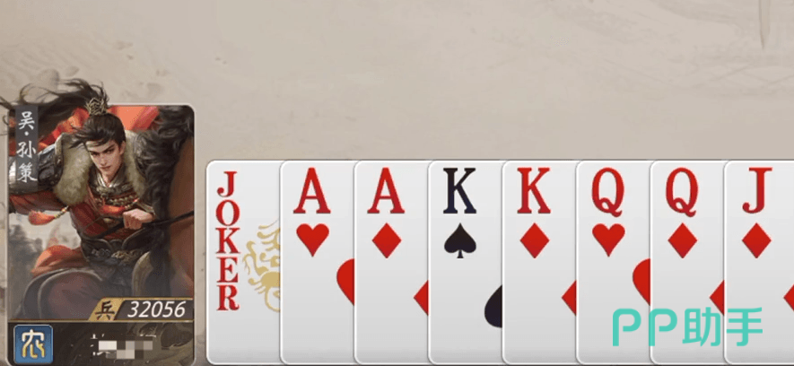 孙策拥有专属被动:开局自动将K补足至3张。主动技能“借兵”可在自身无牌可压时触发——弃置当前手牌中点数最大的一张牌,跳过本回合压牌阶段,并随机获得一组点数≥J的对子。该技能虽规则简洁,但实际运用需高度依赖局势判断与资源取舍。