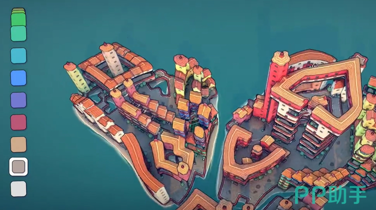 在外观表现层面,游戏提供多组预设配色方案,选定后即可实时应用于新建房屋;已建成的建筑亦支持即时换色——仅需选定新色系并覆盖原结构,即可完成整体色调调整。更值得注意的是,建筑形态并非固定模板:同一基础房型会因高度差异、邻近建筑间距、底部支撑基座是否存在等变量,自动呈现差异化轮廓与结构细节,确保最终成型的城镇景观丰富而不重复。