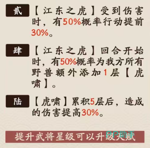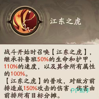 “江东之虎”普攻对敌方前排目标造成150%基础伤害,该伤害由前排全体分摊,单体压制力有限。因此建议优先将该召唤物绑定至必杀技释放环节,以最大化输出效率。此外,只要“江东之虎”处于场上,即可为我方所有野兽系武将施加“虎啸”效果——该效果在孙鲁班被控制时失效。每层“虎啸”提升20%暴击率与20%暴击伤害,最多叠加5层;3回合内即可完成满层构建,显著强化队伍整体爆发节奏。