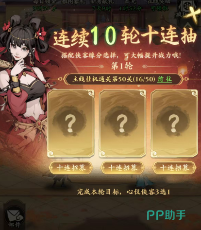 开局阶段,「疯狂百抽」是获取主力侠客的核心入口。该活动需主线推进至20级后解锁,位于「闯荡江湖」副本模块中。参与百连抽不仅可稳定获得高适配度的前期侠客,还能同步完成词条任务,领取一次随机高级侠客——虽不可指定,但SSR/SR出率显著高于常规招贤池。获取优质侠客后,应立即投入「游历」系统:该玩法依赖阅历值驱动,而阅历值主要通过挂机自动产出。建议新手优先提升挂机效率,积攒足够阅历后刷新高奖励游历任务,派遣侠客执行即可持续获取铜钱、突破材料、升品道具等关键养成资源。