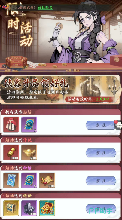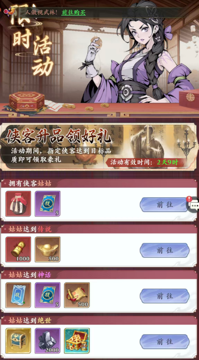 若铜钱储备紧张,新手期可重点参与平台提供的新人成长任务体系。该体系分为常规任务与限购任务两类:常规任务奖励充足,基本可覆盖前期铜钱与元宝需求;限购任务则建议结合自身规划理性选择,例如通过「无双好礼」活动获取神话品质侠客,即能快速构建核心战力骨架,大幅提升开荒效率。