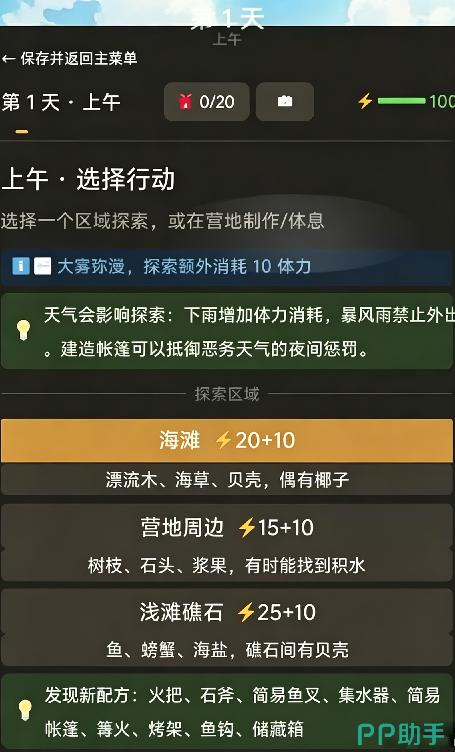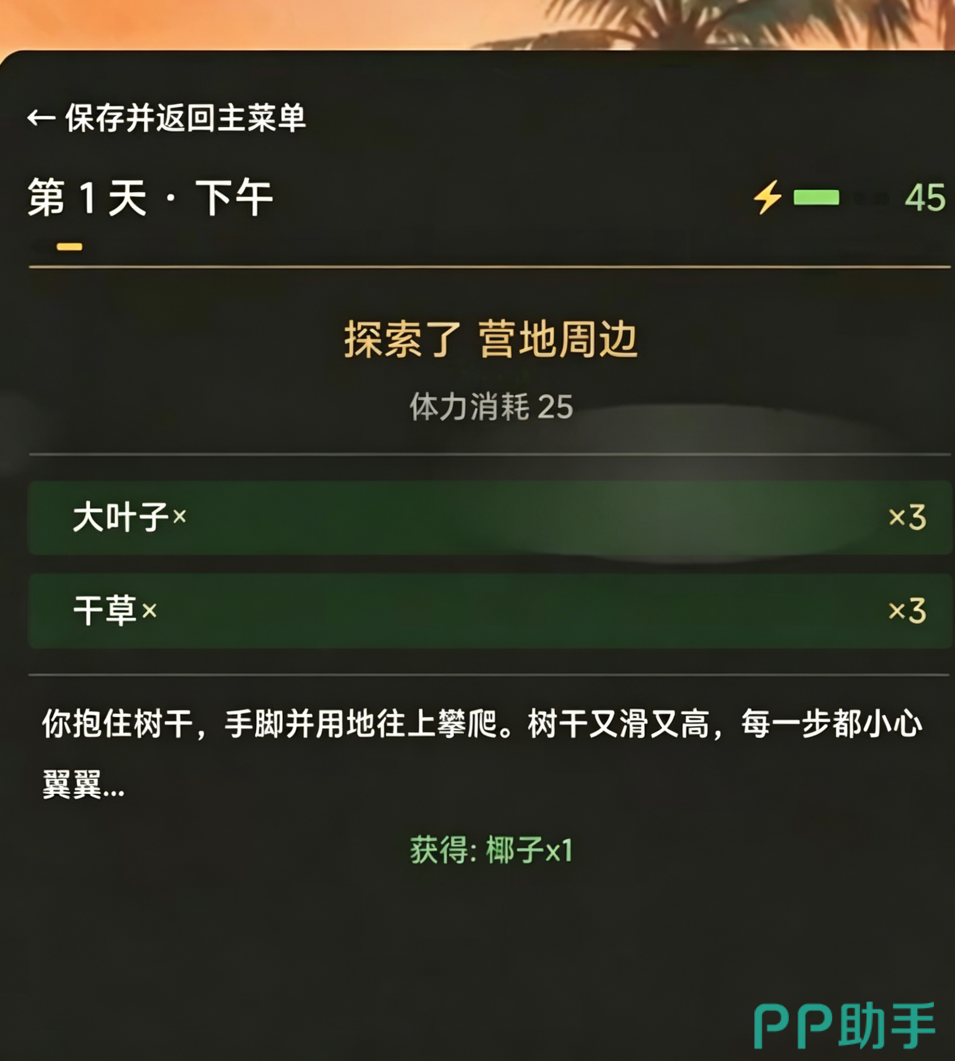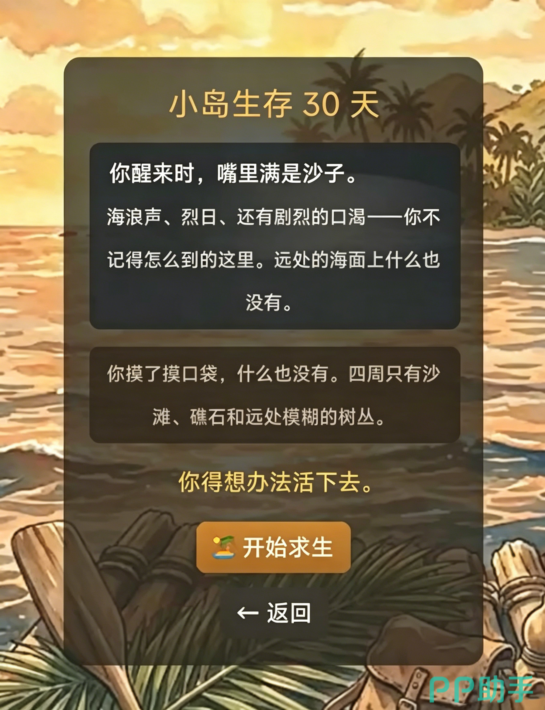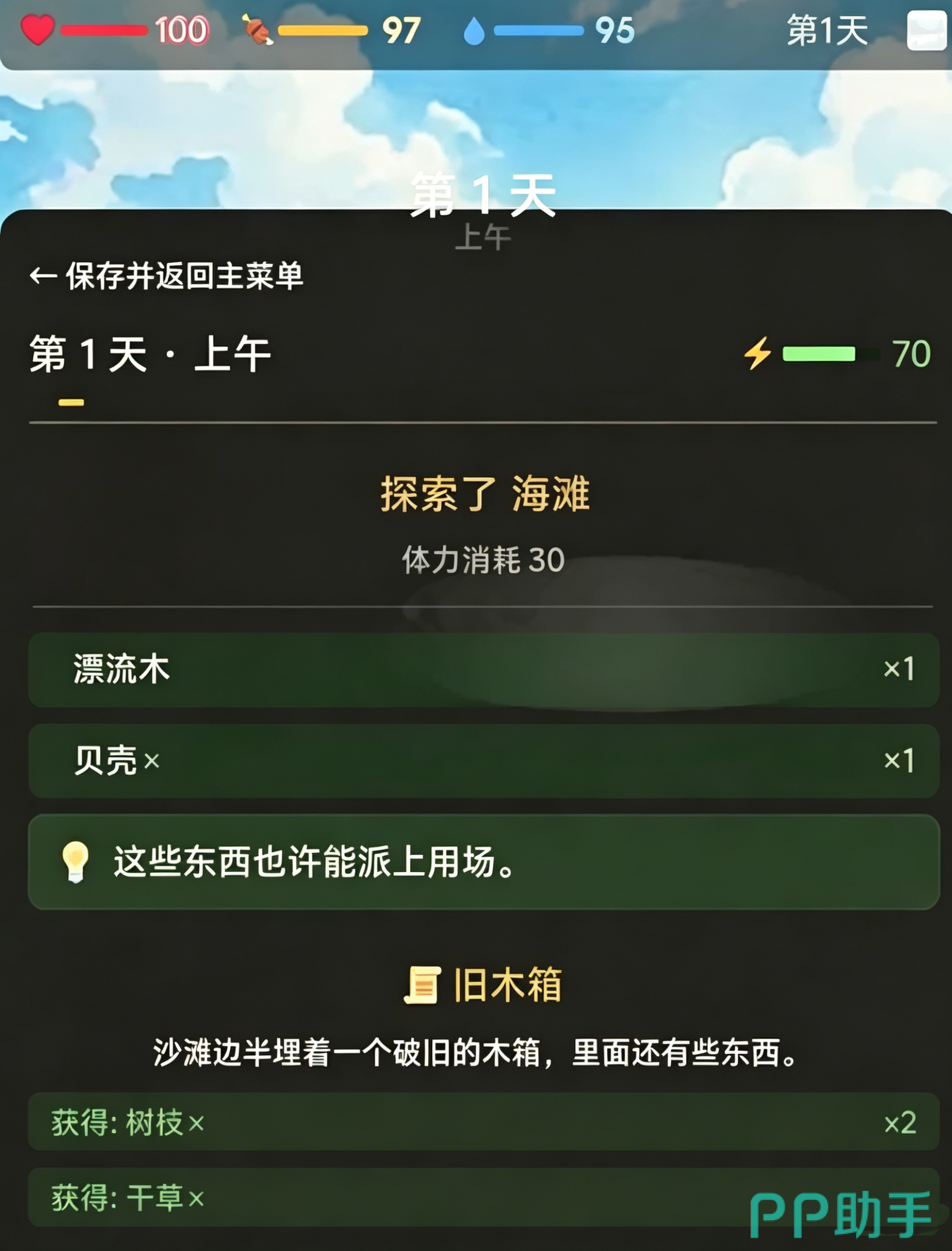 游戏中设有实时状态面板,清晰显示当前体力、饥饿度、水源储备及环境威胁等级,并同步推送多分支交互选项。当体力临近枯竭时,可主动选择休息恢复;每过一日即进入全新时间节点,所有事件、资源刷新与NPC动线均不重复。成功存活满30天即可达成基础通关目标,之后仍可自由探索岛屿全域,包括系统预设的全部椰子采集点及其他隐藏要素。