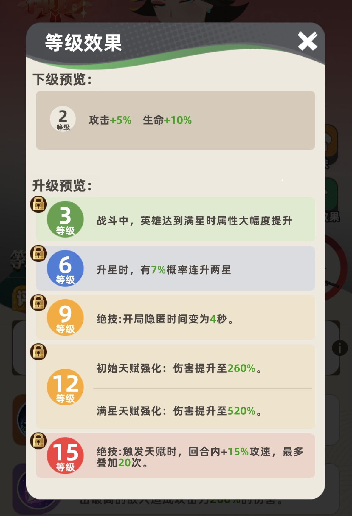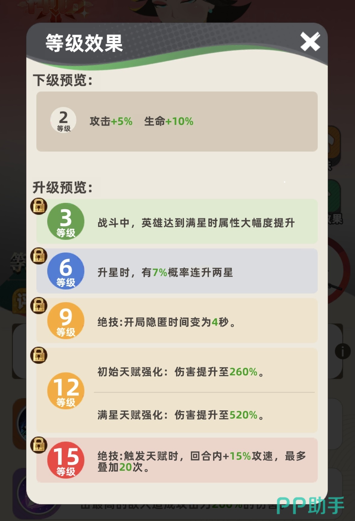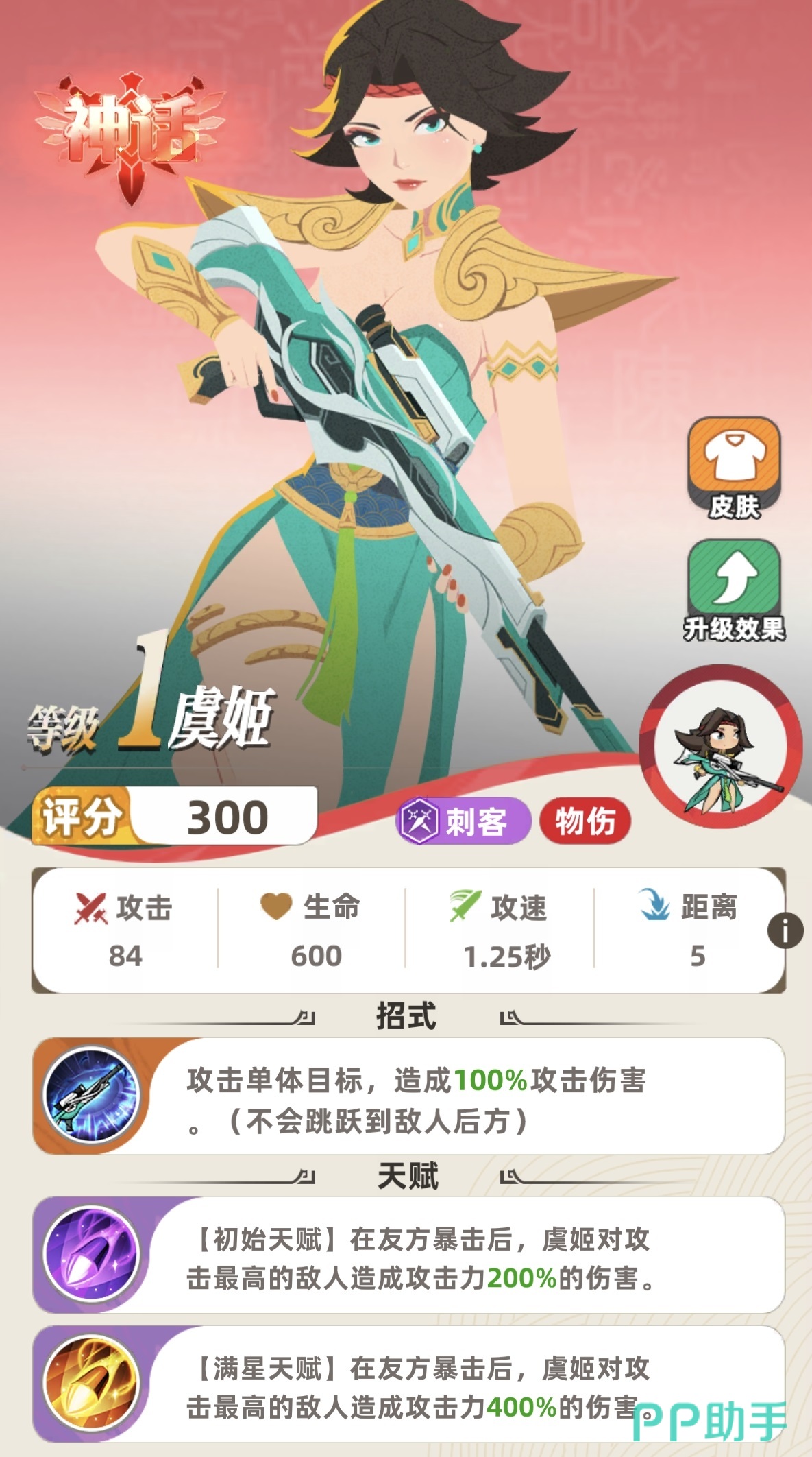 虞姬的被动天赋具备明确的触发逻辑:当任意友方单位成功打出暴击时,她将立即锁定当前场上攻击力最高的敌方目标,发动一次高额物理伤害。该伤害在英雄升至满星(三星)状态下,增幅可达400%。由于高攻单位多为敌方核心法师或射手,此机制使其具备极强的定点清除能力。等级成长方面,她在9级时获得关键质变——开局隐匿时间延长至4秒;满级后,每次触发天赋还将额外提升攻击速度,且该增益效果可叠加。叠满后攻速显著跃升,形成高频连击压制,后排脆皮难以承受持续输出压力。