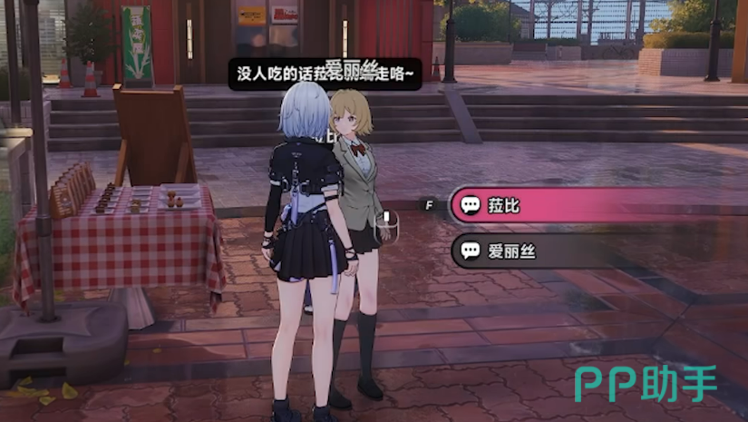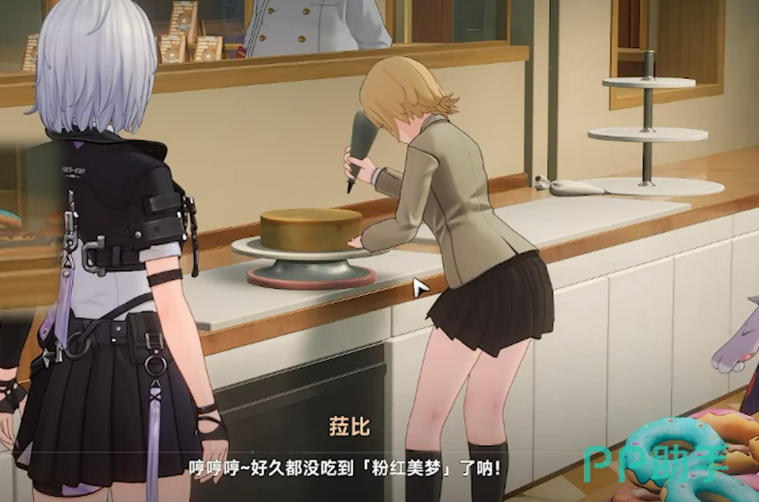 与菈比对话结束后,第三次进入烘焙坊,先后与爱丽丝完成交互。步出店门向右移动,将触发专属剧情。演毕折返,再次与爱丽丝对话,随后寻找JTF队友完成联络。之后重返菈比处完成同步沟通。上述三重对话闭环完成后,最终进入烘焙坊与爱丽丝进行终轮交流。