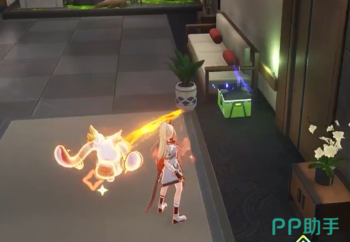 拾取首箱后无需下楼,立即转向大厅东侧休息区。此处布置有双人布艺沙发与木质镂空屏风,二者呈L型摆放,间距约0.9米。第二只宝箱紧贴屏风右侧立柱底部,箱体表面纹理与地板反光一致,视觉融合度高。建议清剿周边两名巡逻敌人后,以低角度环视沙发底座与屏风接缝区域,可稳定定位该箱。内含基础恢复剂×3及源质结晶×1,属前期稀缺资源。