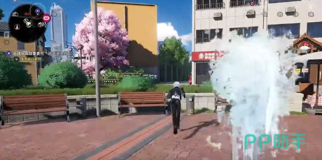 以当前变电箱为参照,从其右侧缺口纵身跳落,完成第七处收集。落地后正对所处大楼,绕至建筑后方寻找涂鸦墙,沿涂鸦方向左转,可见樱花树;跃上邻近绿色围栏,第八处赠礼自动触发。