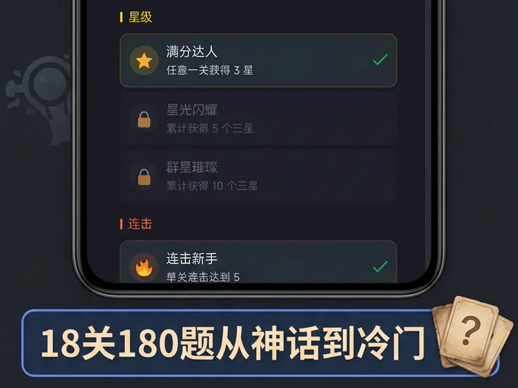 共设置18个关卡,累计包含180道题目,每关通过持续出题推进,难度随关卡升级逐步提升,从基础认知到冷门知识层层递进,持续激发玩家的挑战欲。
