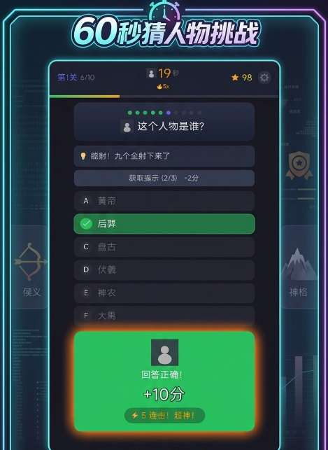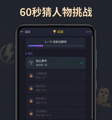 游戏以“60秒倒计时”为核心规则,玩家需在极短时间内根据提示快速猜出人物角色,营造紧张刺激的闯关氛围,充分考验反应速度与知识储备。