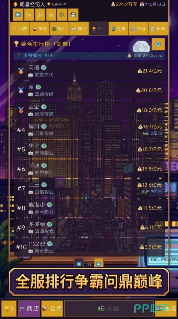 所有的部门在全都解锁以后,还能够进行升级哦,只要不断的升级部门,那玩家所经营的经纪人公司还可以获得相对应的经营加成,等自己的经纪人公司到达了一定的规模以后,玩家还可以在全服排行榜中,去和哪些排在排行榜中上榜的经纪公司去争夺排行榜上的名词哦。