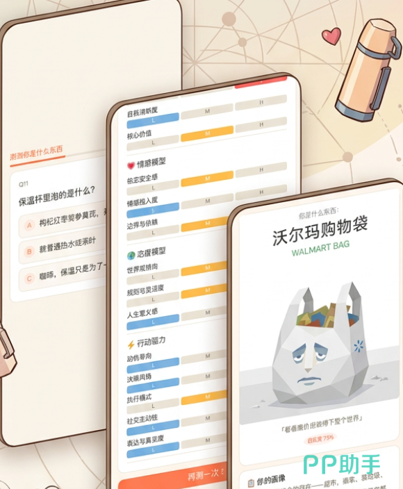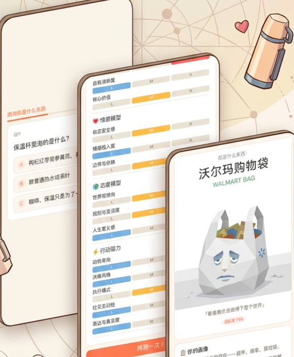 游戏的核心魅力就是把抽象化的性格转化成为具体的物品人格,在玩的过程中真是相当的梗又解压,并不追求专业的心理准备,主打的就是边损边懂的模式,结果也是很离谱的,当然多次测试之后就会解锁了更多的人格,新鲜感拉满,对于喜欢社交的玩家们来说,也是相当值得分享的。