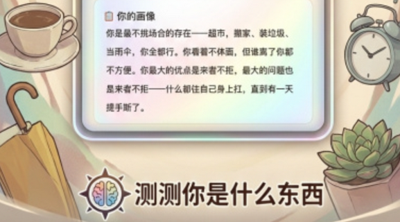 在答题的过程中,不同的选择也会影响到最终的结果,不过题目之间都是相互呼应的,让测试的代入感变得越来越强,全部答完之后,系统就会瞬间的产生一个专属的物品人格。每一种物品都是自带标签的,而且这些魔性的表情包以及扎心的文案,真是戳中了更多人的痛点,不过结果的页面带有着趣味性的朗读,并没有硬生生的说教,总是让你感受到一种不一样的调侃。
