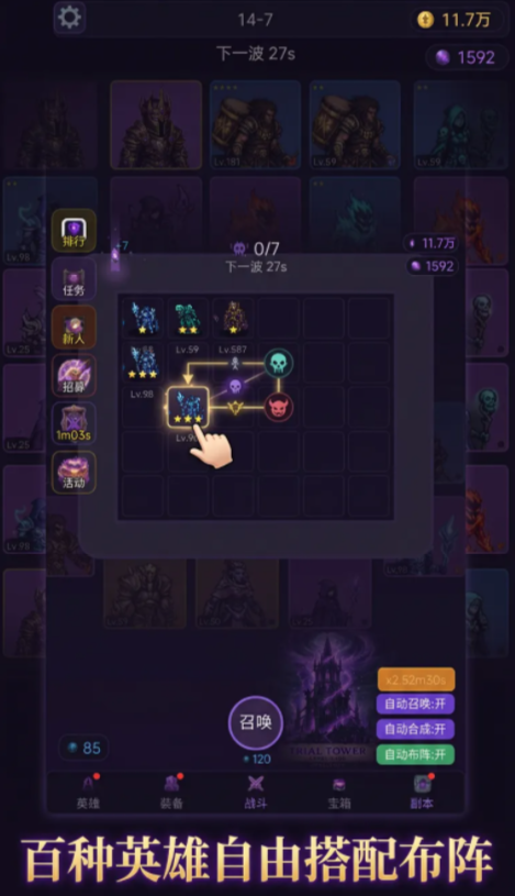 在进入游戏之后,玩家首先要完成英雄招募,每个英雄都会有不同的特色,对应的技能属性也会有所区别,玩家可以通过不断合成的方式,提升英雄战力等级,让角色打出更高伤害,每次完成英雄合成之后,都会让角色拥有更强的技能效果,玩家可以在挑战过程中,不断提升英雄等级,让角色拥有更强的策略能力,角色战力会对副本胜负产生直接影响,建议成员在游戏里多去操控不同的职业加入战斗,选择出最适合自己的培养。