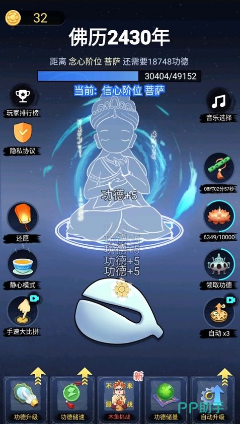 想要试试这种佛系修仙的朋友,可别再乱找了,认准这个积点功德手游下载的正版途径,别再下到那些乱七八糟的盗版包糟心。这个游戏真的是最近难得的解压好东西,不用你费脑子肝,也不用你花钱,闲下来敲两下木鱼,攒攒功德,放松一下自己,比玩那些打打杀杀的游戏舒服多了。
