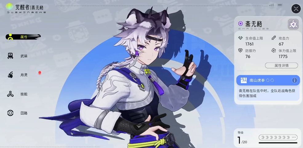 第二个我为大家介绍的就是斋无格,斋无格目前在四星效果当中,主打的就是一个近战输出,带来的各种物理攻击能力当中的伤害数值也是不差的,另外他在连招效果当中,其实做出来的招式是非常流畅,利用5段拳脚相交攻击效果还可以带来更多的近战真伤能力,不过在战斗当中,他贴近敌人进行攻击的时候,可以带来的操作会更多一些,因为他自身的躲避功能也是比较准确的,通过此类技能进行搭配,团队当中他实现近战攻击之前可以积攒自身的充能能量,充满以后,长按普攻就可以进入一贯周身的状态当中,只要是进入这个状态当中,斋无格可以获得10秒的普攻强化功能,30%的攻速以及15%的金属性伤害加成,可以保证他在这个期间的伤害数值提升非常高,后期获得了训示以及雷星的增益效果之后,可以保证他叠加更多的攻速,所以残血状态之下的斋无格打出来的伤害输出也是有很强战力效果的。