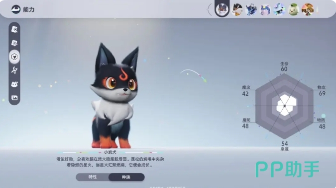 第三个小炭犬,也是开局很多玩家会选择去尝试抓捕的伊莫,它自身的活属性功能在新生期的时候就有一定的使用强度,游戏当中因为很多的解谜宝箱都是要运用到火的,所以在前期大家比较缺少火系的伊莫,在这里小碳犬如果进行远程使用的话,还有一定的点燃功能,而且在解谜当中,小炭犬只要展开进化就能增强这里的火焰效果,进化之后它就会变成焚火狼,此时在奔跑的速度上面还有特殊的加成效果,在帮助大家跑图的过程当中,它是可以作为一类骑乘伊莫的,后期在最终的形态里面还拥有火拳的技能效果,打出来的爆发能力也是非常强的。