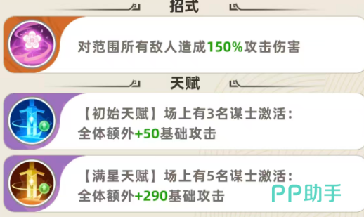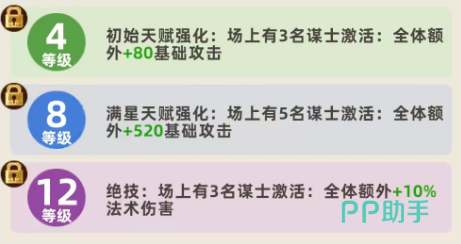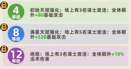 另外在貂蝉上场的情况下,如果我方其他的成员带的都是谋士队的成员,那么这里形成一个5谋士阵容,貂蝉能够给我方的其他角色都带来非常高的基础攻击,也算是一个非常好用的增伤类型角色,后期升级的情况下,她最高是可以升级到12级,这也是貂蝉目前能够达到的最高上限,一般在达到4级的情况下,她的初始天赋就会得到强化,场上只要有三名谋士,就可以激活一个全体的额外增强效果,这里是80点的基础攻击增强效果,如果把她升级到8级的情况下,这里满星的天赋强化了以后,场上只要有5名谋士存活的情况下,她全体的额外增强就变成520点的点数,这里确实是有非常高的增伤数值,所以我方如果谋士队需要增伤的情况下,大家就可以用到她各方面的升级以后的技能效果来进行增伤。