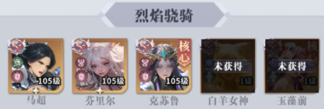 最后给大家推荐的还有烈焰骁骑队,这个阵容里面大家可以用的是马超、克苏鲁、芬里尔,白羊女神以及玉藻前,这个阵容其实玩起来的话,只要拿到马超,大家就可以快速成型了,因为马超可以给其他的角色带来点燃的效果,也就是持续输出类型的功能,这部分的能力是可以保证她在场内带来有效的输出,而且在多回合的点燃功能快速叠加,每一层都可以给敌人带来更高输出的同时,还搭配了类似于克鲁苏鲁这样的核心输出角色,保证了场内持续输出跟引爆伤害同时都有,包括芬里尔女神跟玉藻前,在这里也是可以保证这个阵容里面点燃效果持续进行循环的,她们的功能组合在一起的话,是非常适合跟马超进行搭配的,所以大家如果要玩烈焰骁骑队,这几个角色是最适合放在一起使用。