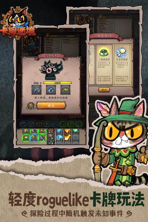 一个肉鸽策略卡牌手游,玩家需要扮演猫咪勇士拯救陷入噩梦的艾琳,游戏采用多层迷宫探索机制,每关地图的路线敌人和掉落物都是随机生成的,每个地图还有四档难度等级。玩家可以选择战士、法师等六种职业,每个职业有各自的天赋树需要养成。战斗采用的是类似于万智牌的卡牌对战,玩家能收集到各个职业对应的装备、法术等卡牌。