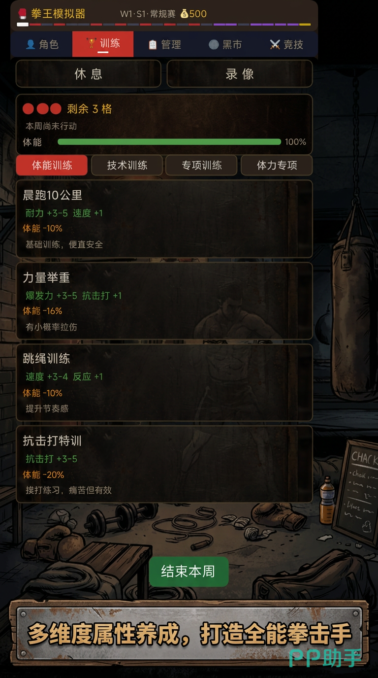 游戏采用模块化养成体系,支持体能、技术、专项能力三维同步提升。每日训练计划涵盖力量强化、步法精进、防守反应、耐力储备等细分项目;完成全部训练后,系统将自动生成体能完成度报告。每场职业赛事结束后,玩家可回放完整比赛录像,结合击打命中率、移动轨迹热区、回合节奏分布等数据复盘表现,针对性优化战术策略。