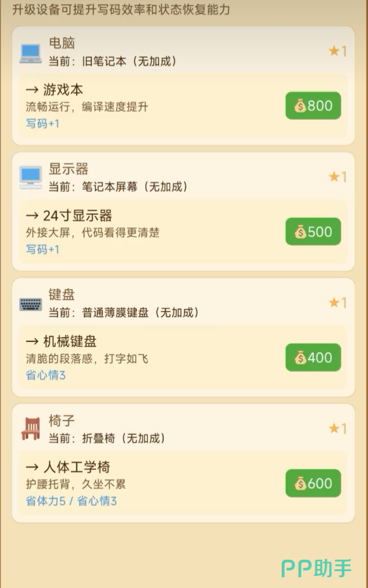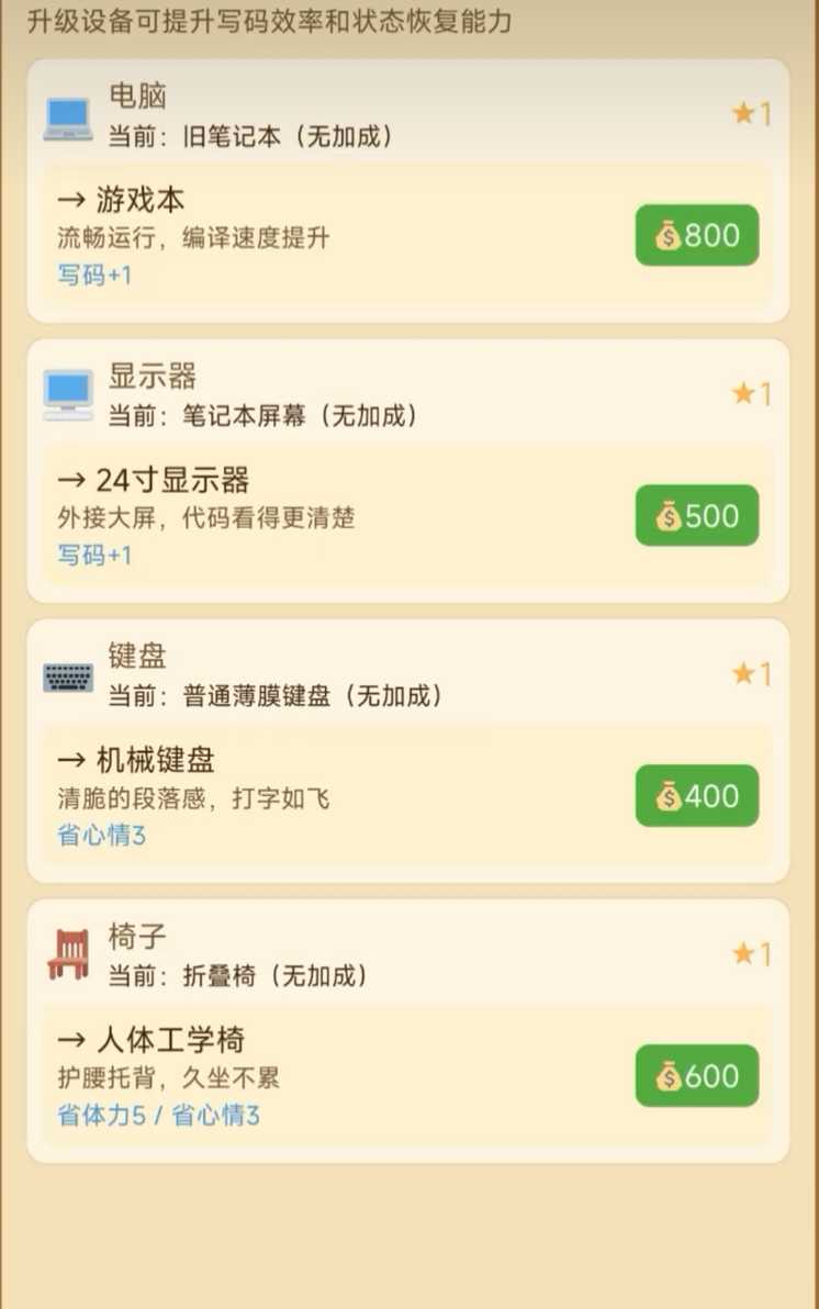 社交系统同样具备丰富玩法。玩家将与多位风格迥异的NPC建立联系,提升好感度可触发隐藏支线,例如解锁优质客户资源、获得折扣采购渠道或获取限时内部订单。装备系统覆盖硬件升级路径,包含电脑主机、机械键盘、专业显示器等可更换部件,高性能设备显著提升单位时间产出效率。部分玩家倾向打造高配开发环境,实现产能跃升;另有特殊玩法如参与黑客马拉松活动,在限定周期内挑战高强度开发目标,收益可观但失败惩罚明确,考验玩家对节奏与风险的综合判断能力。