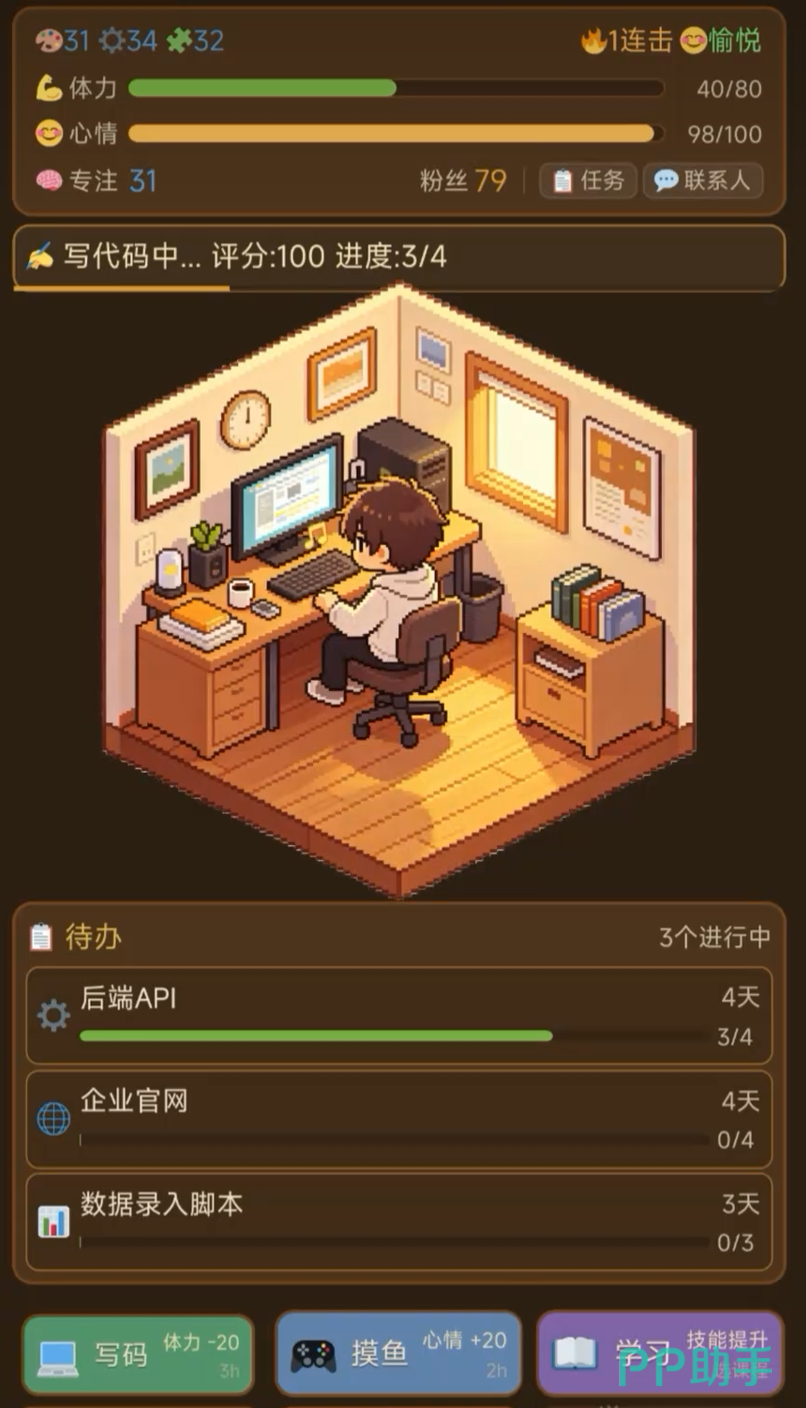 游戏采用强叙事驱动的模拟机制。初始阶段仅拥有一间简陋住所与一台基础配置电脑,玩家需通过完成各类开发任务积累资金与经验。订单难度梯度递进,报酬随技能成长逐步提升,但生活成本同步上涨,尤其是房租始终构成持续性压力。玩家需自主规划每日行为:选择通宵攻坚还是规律作息,承接高风险高回报项目抑或稳扎稳打接中小单。所有决策实时影响角色属性变化,包括专注力、心情值、健康度等维度,进而左右编码效率与任务成功率,增强代入感与策略深度。
