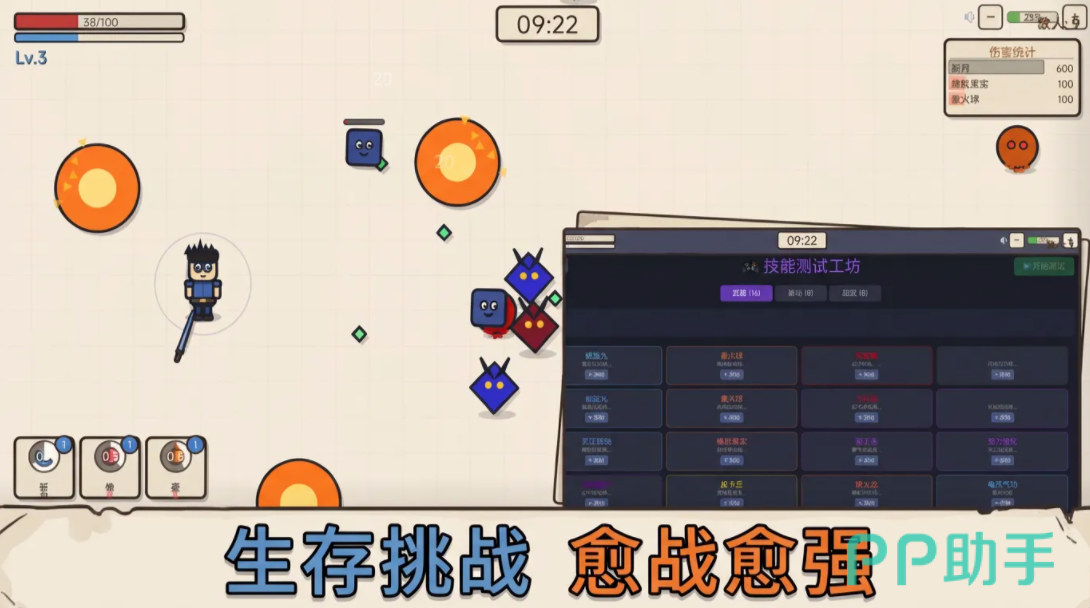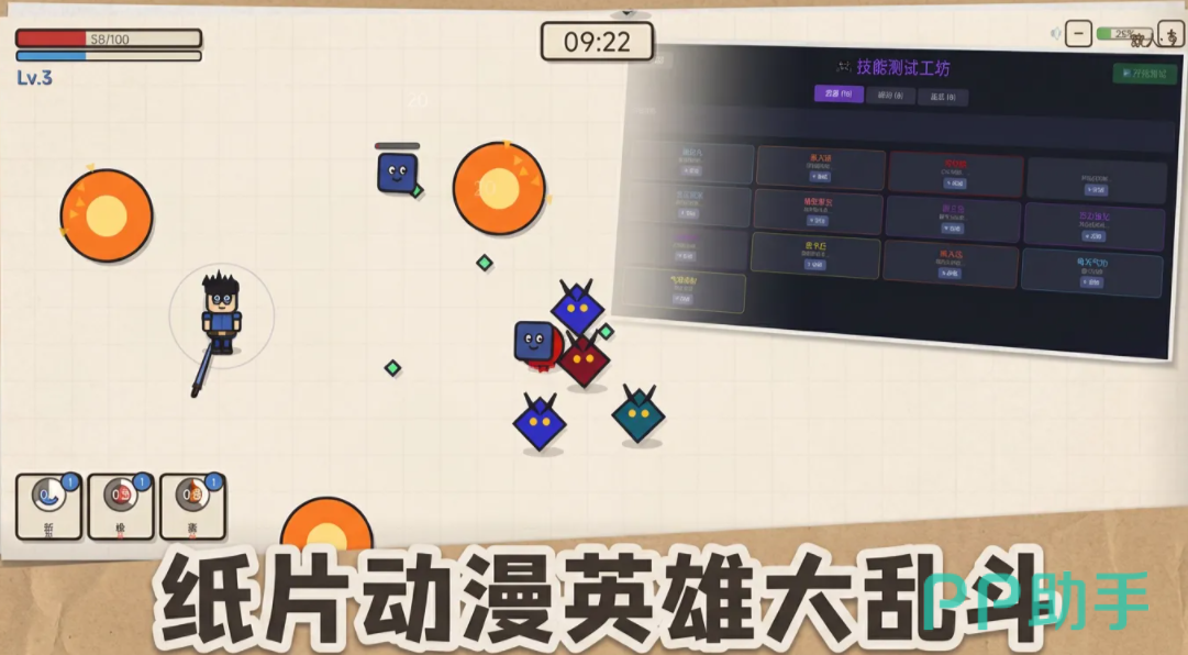 进入游戏后,玩家将操控一名纸艺风格英雄,置身于纯白基底的纸面世界。该场景中会持续刷新形态各异的敌对单位——所有怪物均由基础几何图形构成,仅通过色块区分类型,并标注明确血量数值。玩家需依据目标颜色特征与剩余生命值,实时判断技能释放优先级。击败敌人后,现场随机生成技能图标,角色靠近即可拾取,从而在后续波次中组合运用,形成差异化输出路径。