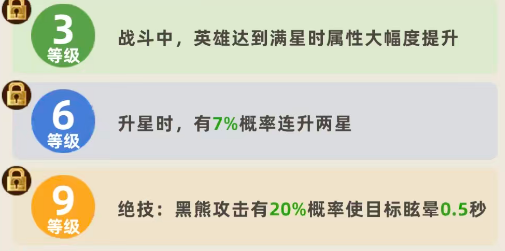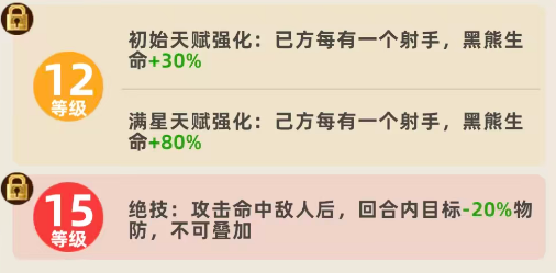 孟获进行升级的情况下,大家就要注意在升级的时候,基本也是给这里的召唤物带来提升,在升级到9级的情况下,这里黑熊的攻击能力会有20%的概率,可以在其中攻击敌人的同时,对敌人产生一个眩晕的效果,这个眩晕一旦触发成功的话,敌人后续的0.5秒时间之内就会无法进行行动,虽然这个时间比较短,但是大家要抓这个时间来对敌人进行各种集火攻击的话,还是比较有用的,毕竟这里很多角色的攻速都是非常快的,而另外升级到12级的时候,这个就可以看到,他初始天赋当中得到的强化,是己方每一次有一个射手进行搭配的情况下,黑熊它的生命数值就会得到30%的加成。而另外在12级已经是满星的情况下,天赋强化能力当中,就是己方每次有一个射手上阵,给他带来的功能加强,就是在生命数值当中增加80%的效果,所以在这里如果能够达到12级的情况下,黑熊能够得到的生命加成就是最多的。