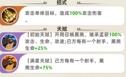 在有生命加成的情况下,黑熊可以在场上生活的时间更长久一些,保证了孟获他自身的生存功能,另外在他的天赋达到满星的情况下,此时召唤出来的黑熊,每有一个射手上场进行加成的时候,生命数值会增加的百分比变高,直接达到了75%的加成效果,所以在这里其实如果有更多的射手角色搭配的情况下,黑熊被孟获召唤出来以后,这里可用的时间也是非常久的,而且后期通过黑熊这样的功能,大家可以提升的输出也是比较多的,毕竟黑熊在场上会不断的对敌人进行进攻,这里还有孟获后期得到加成之后,他可以在场上生存的时间更长久,敌人带来的攻击数值也就自然会越高。