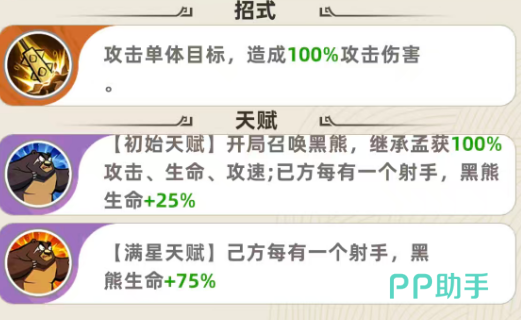 游戏当中的孟获目前在神话品质当中的知名度还是比较高的,自身作为射手的情况下,攻速也还可以,基础的攻速具有2.86秒的强度,比一些角色攻速达到3秒以上的情况已经好很多了,而且他这里能够带来的物理伤害输出,后期在攻击敌人的时候,作为单体输出效果比较强的角色,可以造成的攻击伤害也是达到了百分百的数值,另外在通过天赋加成的情况下,他一开局就可以召唤出来一个黑熊,黑熊在这里作为他的召唤物,可以通过天赋能力去攻击敌人,而且黑熊自身也是继承了孟获基本属性当中百分百的数值,这里数值包括的是攻击生命以及攻速,可以让我方在召唤物效果当中,基本是拥有了另外一个孟获在场上一样的功能,而且另外就是场上每有一个射手的情况下,这里黑熊的生命数值就会有25%的加成,所以建议大家把孟获获放在射手阵容里面,有五个射手的情况下,这里黑熊他得到的生命加成就非常的高了。