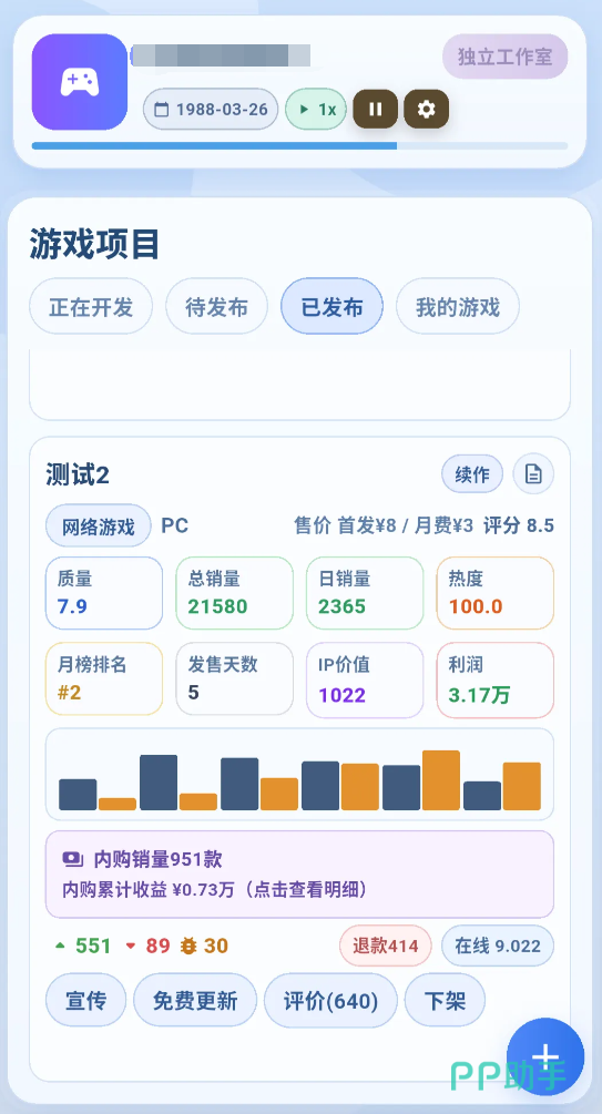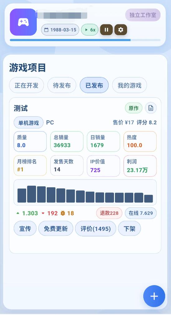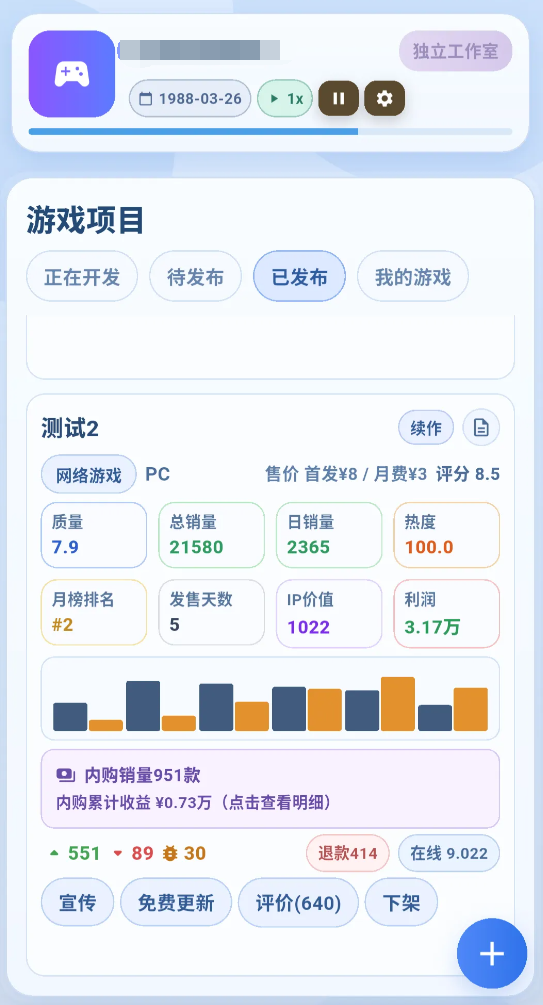 资金链管理是贯穿始终的核心挑战。前期预算紧张,必须优先保障高潜力项目投入与核心岗位人才储备;中后期可并行推进多个游戏开发,构建差异化产品矩阵,实现收入结构多元化。游戏内置离线挂机机制:退出后员工仍持续工作,开发进度自动累积,版本上线后还可动态调整售价与运营策略,驱动公司估值稳步攀升。