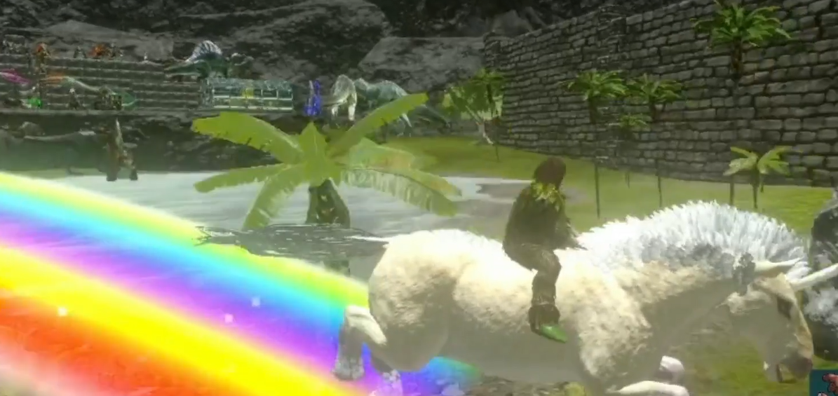 驯服完成后,独角兽可装备庞马鞍具及移动研磨器,基础属性与庞马趋同。差异化能力体现在三方面:第一,跳跃时生成持续3秒的彩虹轨迹特效;第二,排泄物为彩色结晶,食用后恢复少量生命值与耐力,但会触发限时致幻效果(持续时间约15秒),若角色死亡则效果立即终止;第三,该排泄物是垂钓利兹鱼的唯一有效饵料,有概率掉落“奇异的糖果”图纸,用于后续特殊合成。