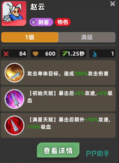 赵云的基础伤害为100%攻击力的单体物理攻击,虽无远程或范围效果,但其成长曲线明显偏向中后期——尤其在8级之后,攻速与吸血属性开始显著影响实战表现。当装备成型、星级提升后,他可通过高频普攻不断触发暴击,从而激活天赋带来的动态增益,实现越战越强的滚雪球效应。