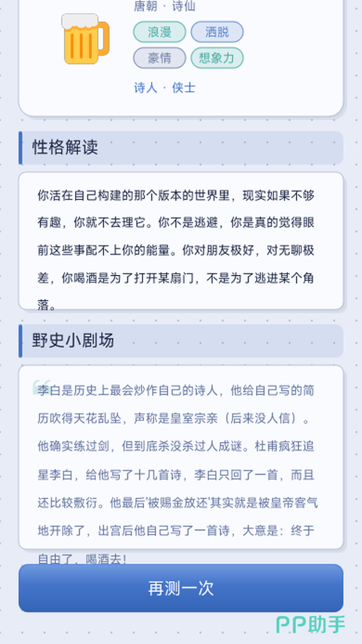 结果页包含双重内容模块:其一是个性化性格解析,语言平实自然,聚焦具体行为特征,常令用户产生强烈共鸣;其二是原创野史小剧场,以轻松叙事方式还原该历史人物鲜为人知的生活片段与思维逻辑,助力玩家建立立体认知。