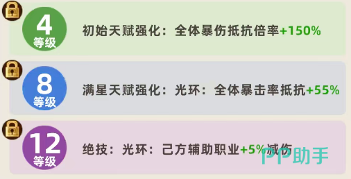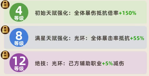 后期提升孙膑各个方面功能的时候,就可以给他进行升级,只要等级达到4级,他在初始的强化效果当中,就是让全体的爆伤抵抗倍率达到150%的加成,此时这个百分比就比初始的情况下多了50%的数值,所以对面如果是暴击队的话,那么这里孙膑可以达到的一个抗暴概率也是可以快速提升起来,等级达到8级的情况下,他的天赋是对于满星的天赋得到强化,光环效果当中,全体的暴击概率抵抗会直接再次提升5%,也就是达到整体55%的抵抗效果,此时敌人要触发自己的暴击就会比较难一些,而他目前因为自身品质的上限是只能提升到最高12级的,所以在最后12级的情况下,孙膑是可以给自己的技能带来己方的加强效果,目前的加强效果是放在减伤的能力当中,根据他辅助职业的能力,一般是给孙膑带来5%的减伤,所以放在这里其实这类减伤也可以让他避免敌人一部分的输出伤害。