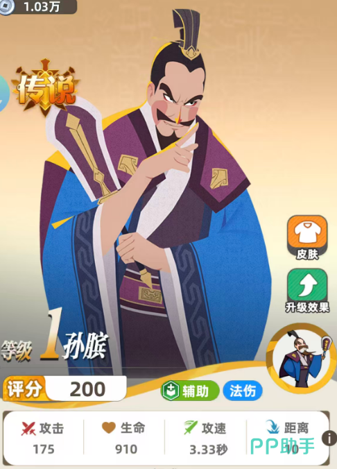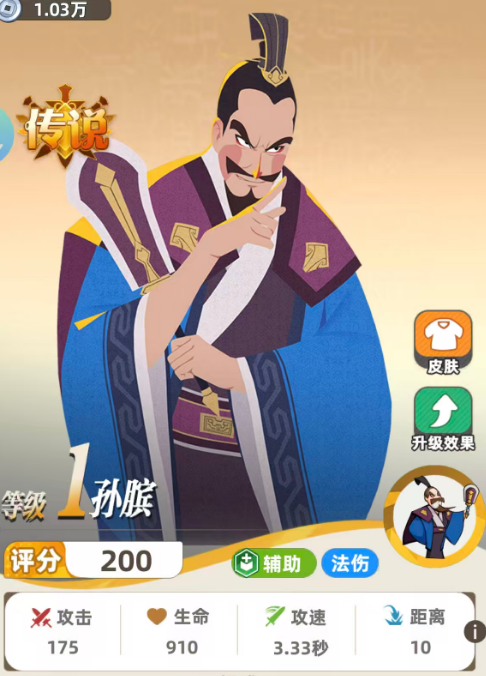 如果大家要学会用孙膑的话,其实技能的机制是非常简单的,游戏当中的孙膑虽然基础的品质没有那么高,只有传说品质的效果,但是在辅助里面他能够达到这个品质的情况下,就说明他上场的概率也不低了,因为目前在红色品质的辅助当中,大家可以选用的还是比较少的,而这里孙膑他的技能当中辅助功能会更强大一些,通过这里一个超远距离的攻击效果,孙膑可以对我方角色造成一个远距离的增益,这里一般在距离他10个格子周围的敌人都可以受到他的法伤加成,目前孙膑在自身的基础效果当中,是可以召唤陨石来对敌人进行输出,此时陨石只要被他召唤出来,向着敌人所在位置,以及周围一格之内的目标,他都可以造成50%左右的攻击能力伤害,所以算成是一类单体类型的伤害效果,但是范围也有增加,可以看成是溅射类型的效果,只能对一个单位目标以及周围一格内的敌人进行输出。