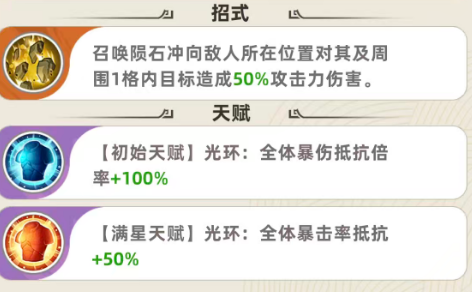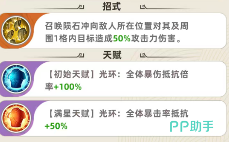 另外后期天赋在初始的光环效果当中,他可以通过天赋带来群体爆伤抵抗能力的倍率,而且一开始的倍率加成就有百分百的效果,在这里大家就要注意孙膑自身的天赋效果在后期不一样的队伍当中,可以使用的情况也不一样,因为在达到满星的情况下,他这里光环的效果就变成全体暴击概率的抵抗,这里暴击概率抵抗会达到50%的数值,所以大家要搞清楚,一个是对于暴击伤害的抵抗,一个是对于暴击概率的抵抗伤害,因为基础抵抗当中就算百分百的数值,也有可能敌人会带来超过百分百的输出伤害,但是这里他满星的天赋当中,光环是根据暴击概率来进行抵抗,所以就是从根源上解决了敌人暴击概率的问题,后期这个比例如果提升起来的话,那么敌人触发暴击概率的次数就会少很多,那么我方在这里就会有更安全的输出空间,所以孙膑达到满星的情况下,这里的抗暴击能力是会更好用一些的。