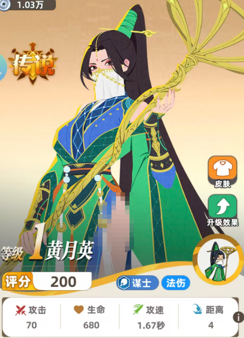 今天给大家推荐的就是黄月英,她目前在游戏当中也是达到了传说品质的一个角色,她自身因为是模式定位的角色,所以目前带来的攻击属性很高,基础的攻击能力就有70点的伤害,而且在这里谋士类型的攻速得到加成之后她的优势还是比较明显的,基础的攻式就是1.67秒,这样的攻速当中黄月英可以带来更高效率的输出,所以在这里他进行法伤的情况下,建议大家快速了解黄月英能够带来的绝技招式,这个招式是让她在攻击单体目标的时候,可以造成其中50%的攻击伤害,虽然很多玩家第一眼看到这个伤害,觉得黄月英作为谋士,可能输出伤害太低了,但是其实她的基础伤害能力并不只有这一个机制。