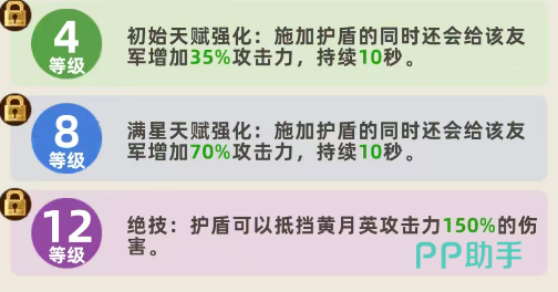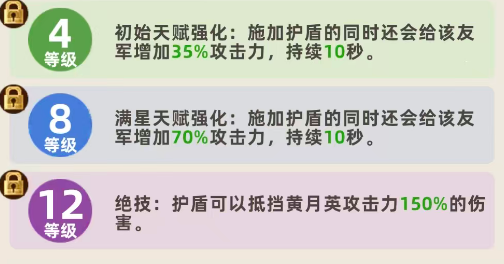 而这个能力达到满星的情况下,给这个友军增加的攻击能力就会提升两倍,达到60%的输出效果,而在其中也是持续10秒的生成时间,本来因为这里大家的攻速都已经是节奏比较快的了,所以这10秒时间大家利用起来的话,谋士队的伤害可以更快速提升起来,说不定在10秒之内就可以一波将敌人全部给消灭掉,后期通过这样的效果来进行提升的情况下,一般到第四级就会有一个变化,此时初始的天赋强化会让施加护盾效果的时候,给友军增加的攻击能力变成35%的数值,但是持续的时间是不变的,另外在等级提升到8级的情况下,这里满星的天赋得到强化,给此类友军增加的攻击能力就会变成70%,而在持续的时间上面,还是没有变化,但是大家可以用到这70%攻击能力提升的时候,就表示我方谋士队进入了最强攻击阶段了,最后在等级达到12级的时候,她通过护盾可以抵挡的伤害变成黄影攻击能力当中150%的伤害数值,通过这个抵挡伤害数值她保护住核心角色的概率也更大。