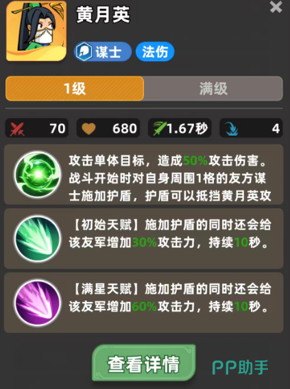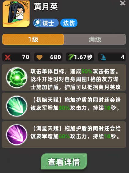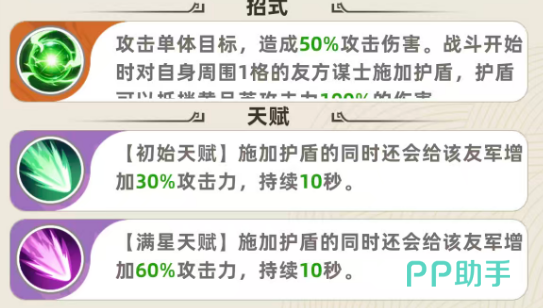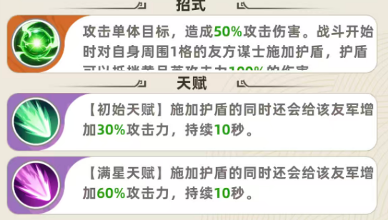 而这里带来的护盾效果在其中也是可以抵挡住攻击能力当中百分百的伤害数值,所以也是非常强势的一个护盾,特别是敌人如果正好上的是谋士类型角色进行输出的情况下,她这里可以抵挡的伤害就非常高了,另外在天赋效果当中初始的天赋功能,就是在施加护盾的同时,还可以给友军增加30%的攻击能力,而且这个能力同样是施加给当前保护的那个角色,也就是说,之前施加护盾的那个角色,在这里就可以受到黄月英同步增加的攻击力,30%的攻击能力可以让本身就比较强的谋士类型角色变得更强,所以利用黄月英这样的攻击效果增强效果来看的话,其实她目前适合的站位就是放在我方输出的前面,而且是一定要放在核心输出的前面,这样子30%的攻击提升,才可以用到阵容的核心当中,持续10秒的时间,也可以让我方谋士阵营里面的核心输出变得更强大一些。