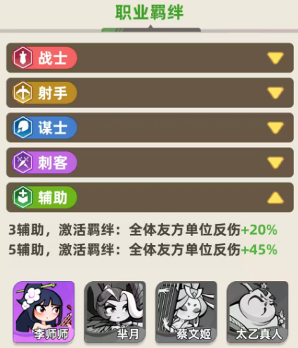 最后是辅助职业当中其实使用的成员还要更少一些的,因为目前辅助职业不可能会将所有的辅助人员都用在一块儿,他们一般是作为支援类型的角色,放在支援空白卡位上面给其他流派带来更多辅助,那么这里有三个辅助的情况下,激活的羁绊就是给全体的友方单位带来20%的反伤加成,这个三辅助的羁绊效果是比较容易达成的,但是五个辅助上阵激活的羁绊是比较难达成的,因为目前游戏当中给大家的卡位大部分情况下是没有那么多的,这里五个辅助上阵的情况下,给友方单位带来的反伤是45%的加成,而大家一般用到的其中成员有李师师、蔡文姬、太乙真人、孙膑还有鲁班,这几个辅助都是游戏当中比较有名的。