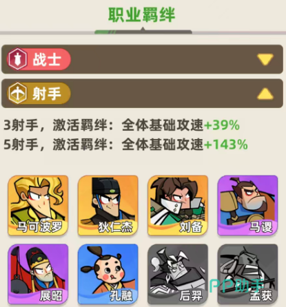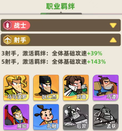 第二个是射手职业羁绊的效果,同样也是分为3个同类型角色和5个同类型角色的上阵能力,但是他们触发羁绊的效果就是全体的攻速能力带来更高的加成,如果是三射手一起上阵的情况下,这里基础的攻速是有39%的提升,如果是五射手一起上阵的情况下,这里的提升是达到了143的百分比,这个百分比目前也是提升了好几倍的,而且对于射手类型的英雄来说,射速是非常重要的一类效果,这里有代表性的角色是马可波罗、狄仁杰、刘备、展昭还有孔融,这些都是射手里面比较好用的英雄。