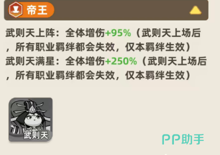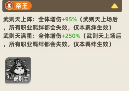 最后在帝王这个职业里面只有武则天跟刘邦两个角色可以使用,武则天如果上阵的情况下,给全体的角色带来的增伤数值上面会有95%,所以在这里她只要一个人上阵,就可以给全队带来羁绊加成,目前如果大家要玩这种整体阵容效果的话,武则天上场其他流派的羁绊就不能触发,只能用帝王职业的羁绊,所以大家上帝王角色的概率是比较小的。