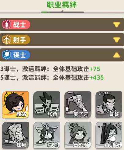 那么接下来就是谋士类羁绊能力,这里谋士中只要是三个一同上阵的话,大家羁绊的全体效果就是在基础的攻击能力上面,增加75点的数值啊,另外如果是五个谋士一起上阵的话,这里全体的攻击能力当中会有435点的加成效果,所以这里也是比较推荐大家用谋士类型的阵容,基础的阵容阶段效果当中,大家用到的有甄洛、张角、姜子牙、周瑜、庄周此类角色,后期还可以通过替换其他类型的角色来保证谋士阵容的支援效果也可以用,而根据这样的模式阵容,大家可以得到的攻击效果也会有更多的提升,这里谋士阵容主要用的各种法力输出效果,也就是他们的基础攻击能力了,所以如果用谋士队的话,输出功能还是比较强大的。