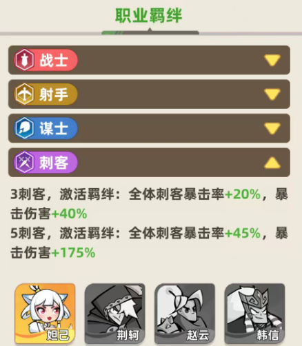 接下来就是刺客职业,一般3个刺客一起上场的同时,带来的是两个方面的提升,羁绊效果当中全体的刺客,暴击率上面会得到20%的触发加成,而另外在暴击的伤害数值当中会有40%的基础加成,到了5个刺客一同上场的情况下,这里羁绊只要激活成功,全体的刺客在暴击概率上面会有45%的加成,而另外在暴击伤害数值上面,则会有175的百分比加成效果,而刺客类型角色当中,大家比较经常用的有荆轲、赵云、韩信、妲己、赵飞燕、刘禅等等此类代表性角色,虽然刺客类型的角色相比其他职业类型的角色要少一些,但是用的玩家还是比较多的。