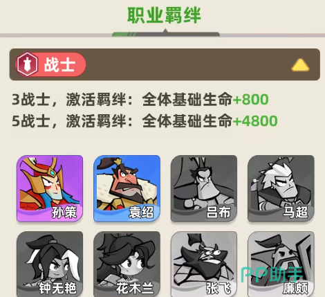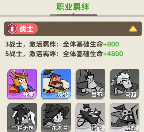 那么在游戏主要用到的就是战士、刺客、谋士、射手以及辅助5个职业之间的羁绊效果,首先是战士类型的羁绊,在其中可以用到的成员有孙策、袁绍、吕布、马超、钟无艳等等代表性角色,如果有3个战士一同上场的情况下,这里激活的羁绊效果是给全体的成员都带来生命数值上面800的加成,但是最强的情况下是无战士的阵容加成效果,此时在羁绊的职业效果当中,全体的基础生命数值上面带来的是4800加成效果,所以这个生命加成的倍率高了好几倍,但是其中只要多两个战士就可以激活这样的职业,羁绊能力也是强度非常高的。