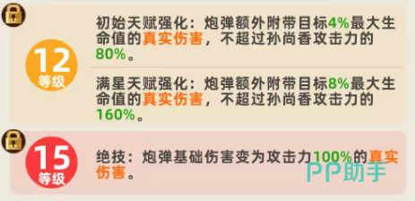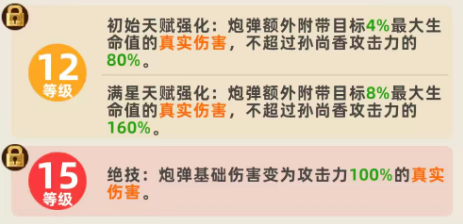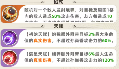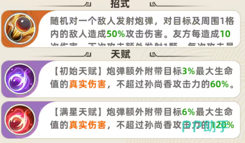 而且后期孙尚香在天赋达到满星的情况下,这里就会附带达到目标身上6%最大生命数值的真实伤害,而且不超过孙尚香攻击数值,这里就会提升到百分百了,所以满星的情况下,孙尚香这里额外提升的输出功能是非常有用的,另外在升级的情况下孙尚香的狙击效果一般到六级的时候就会带来一次阶段性的提升,此时只要友方每造成了8次伤害的情况下,下一次进行攻击,这里会额外发射一颗炮弹出来,每一次的攻击当中额外同样也是可以发射最多5颗,所以上限没有办法提升,她每一次攻击额外发射的数值是最多只有5颗的,但是百分比是可以提升的,在达12级的情况下,初始天赋得到强化,这里炮弹额外附带的效果是目标4%最大生命数值的真实伤害,但是这里不超过孙尚香攻击能力当中的数值是提升了到了80%。