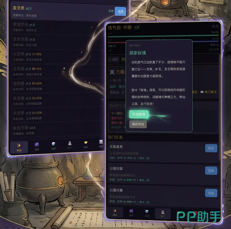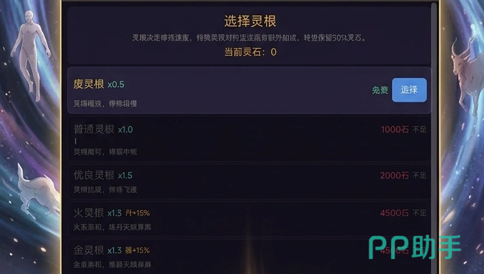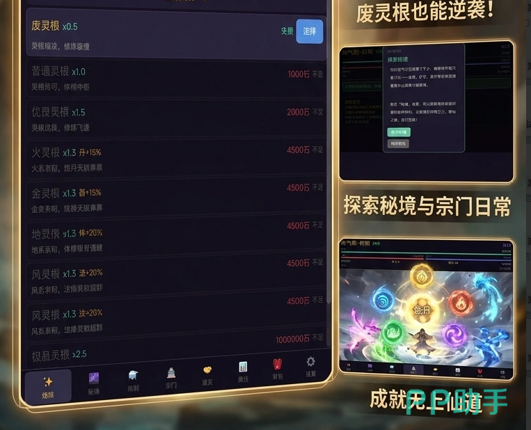 游戏中设定了清晰的灵根成长体系:初始为废灵根,随主线推进与资源积累,可逐步激活普通灵根、优质灵根,最终突破至极品灵根,大幅提升功法领悟速度、灵力上限及战斗容错率,为飞升渡劫奠定核心基础。