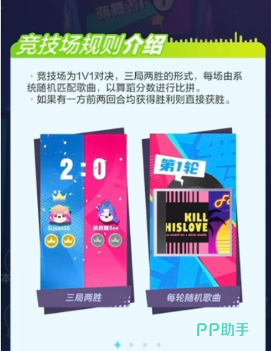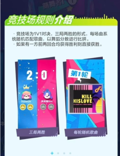 竞技场核心玩法为三局两胜制单挑模式:系统自动匹配实力相近的对手,每轮对决随机分配一首曲目(含经典老歌与流行热单),双方在相同歌曲、相同难度段落下独立完成表演,最终以累计总分判定胜负。除智能匹配外,支持一键发起好友挑战,实现跨服实时斗舞。